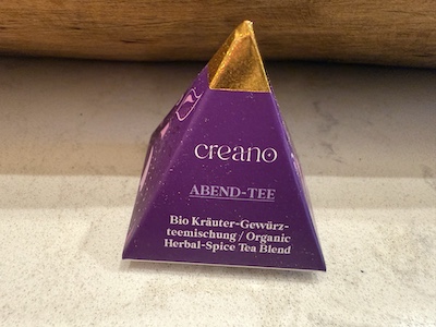 After the lively duo that was Lemon & Ginger yesterday, today’s blend whispered to me with a much gentler voice. This morning’s tea was Abend-Tee, an organic herbal spice blend in a cool pyramid shape from Creano.
