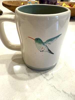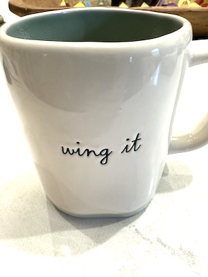 I decided yesterday to enhance my journey, by trying tea in different types of mugs and cups. Up until today, I had been using the same cup each day. I purchased some new cups to try including the one I used today with this sparkling bird and the term "wing it" on the other side.