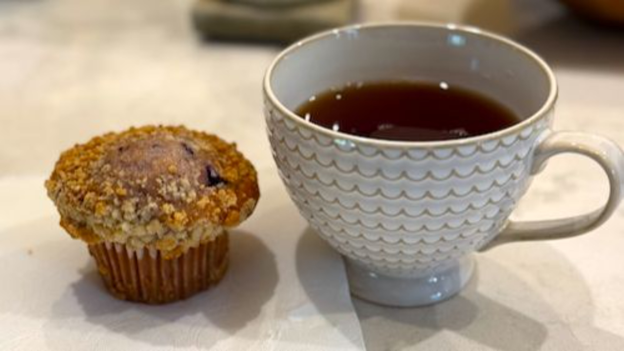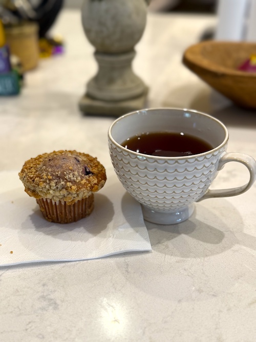 My cup brewed with ceremony: steaming hot water, a lovely steep, a gentle swirl… and—because life is generous—a fresh blueberry muffin sitting cheerfully beside me as today’s scone substitute.