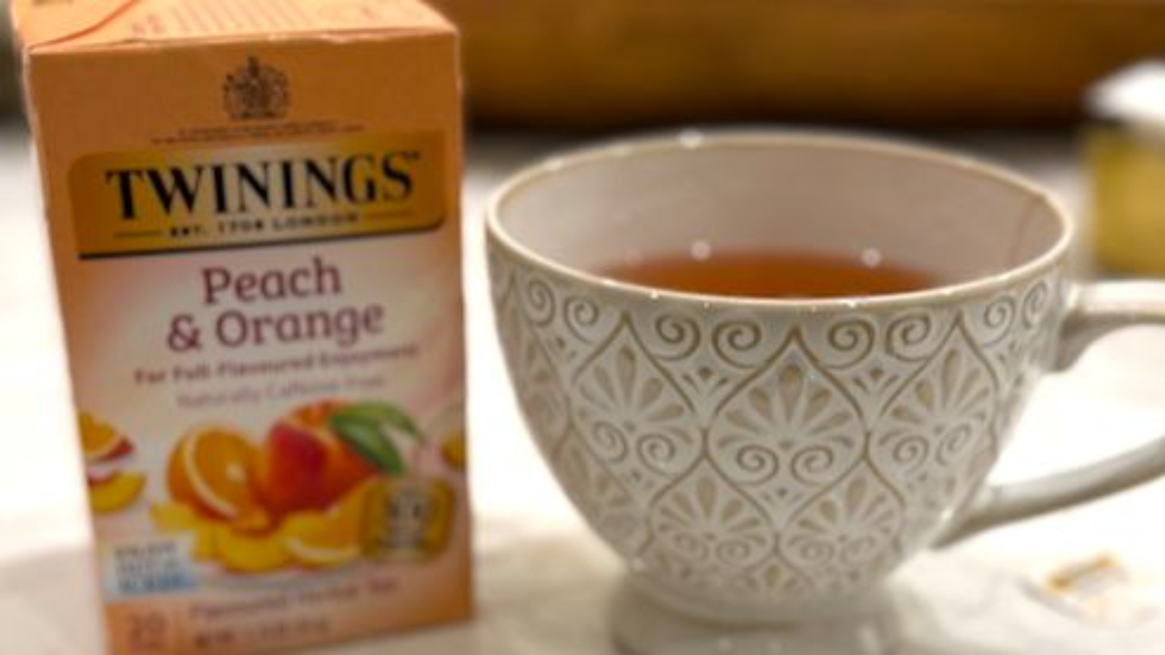 I chose Twinings Peach & Orange, a blend filled with white hibiscus, rosehips, roasted chicory root, and baobab.